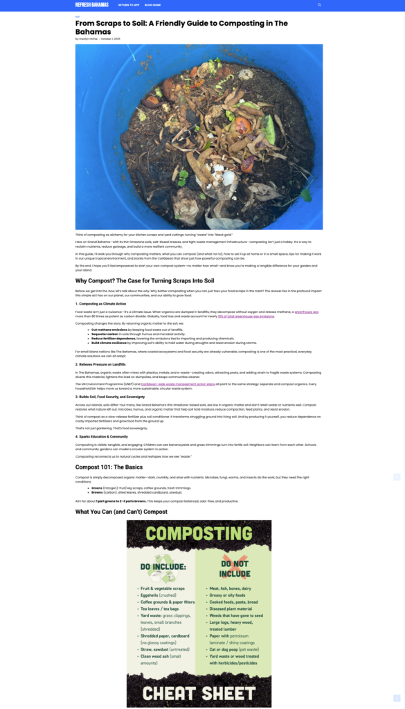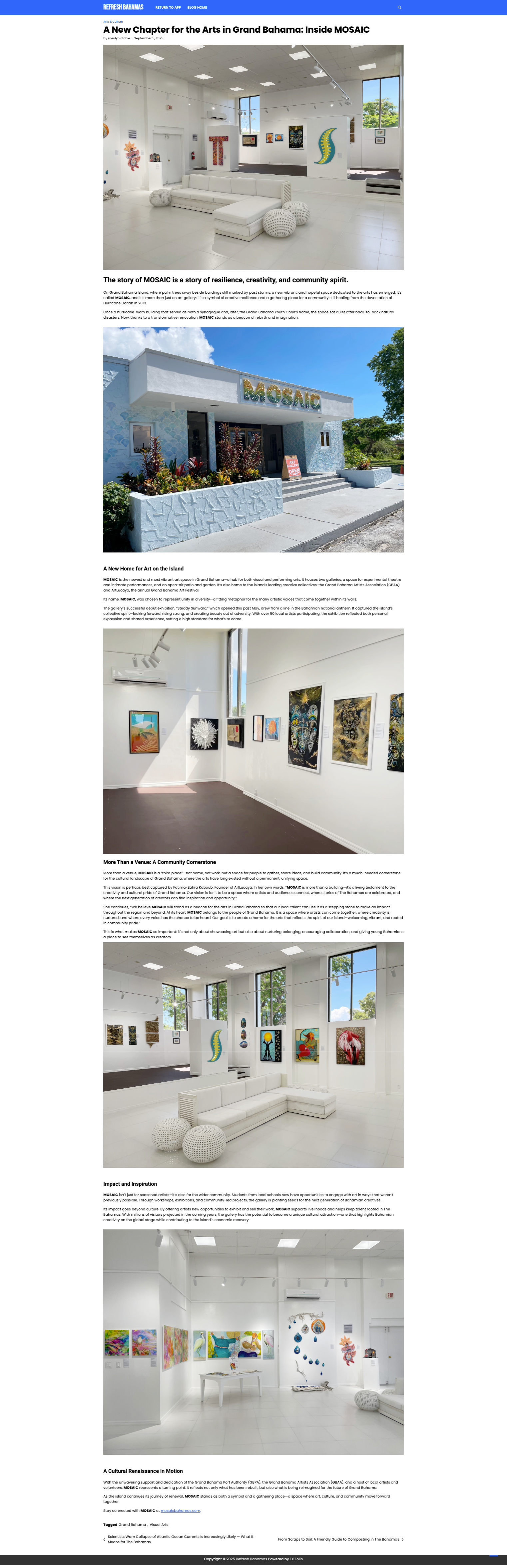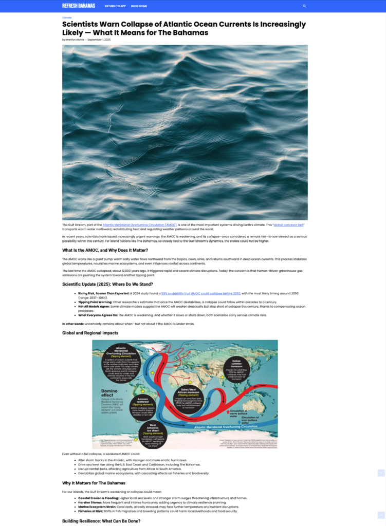 Through my work with Refresh Bahamas, I create mission-driven stories that inform, inspire, and mobilize a community dedicated to building a better, more sustainable Bahamas. My articles explore environmental resilience, scientific developments, cultural revitalization, and community-led action—translating complex issues into accessible reporting that empowers readers to engage and make a meaningful impact. By blending research, storytelling, and digital strategy, my contributions help strengthen Refresh Bahamas’ role as a growing social network for collaboration, innovation, and positive change across the islands.